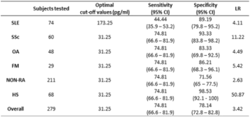 Table 1 (abstract O70). Diagnostic performance of serum IL-22 in distinguishing RA patients from non-RA patients and healthy controls